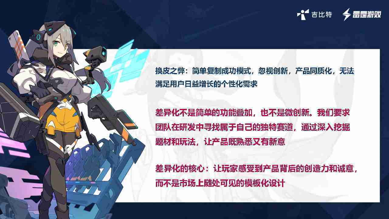 在我们内部是这么定义差异化的。。。。首先,,,,差异化不是简单的功能叠加,,,,更不是换皮。。只是换皮,,,产品无法提供有效的市场价值。。内部经常说差异化的产品不是为了迎合市场,,,,而是找到一个自己独特的表达方式,,,在研发中找到属于自己的细分赛道和独特赛道,,前提是需要对这个题材有足够的深入、、、、挖掘,,,,对玩法有足够深入的理解,,,,让产品看起来既熟悉又有新意。。。。