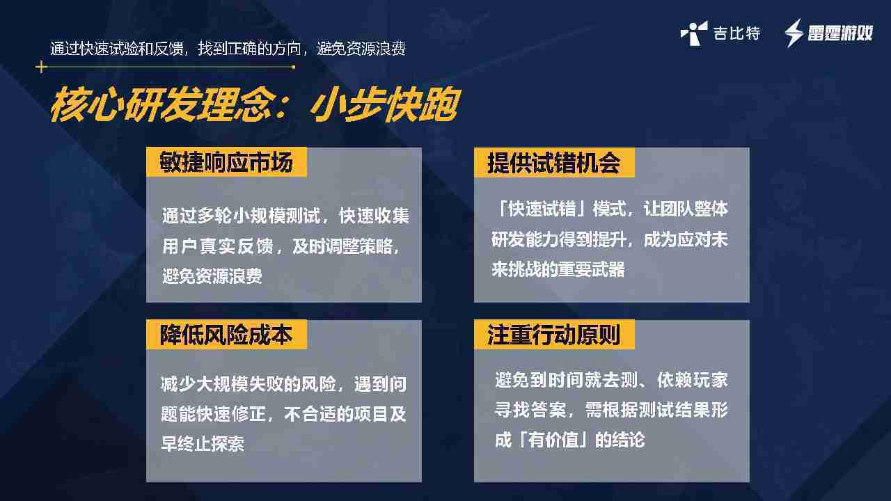 小步快跑不是找答案,,,,而是验证答案。。。。我们之前有项目是这样的,,,,有些制作人会有几个方向觉得都可以做,,,,但是不确定做哪一个,,会选择几个都做,,,,做完拿到市场跑,,跑出哪一个更好,,,,基于这个再做后续的研发和拓展。。。但这种情况最容易出现一个问题,,,,可能被玩家裹胁,,,,玩家说这个点不错、、、、那个点不错,,到底听还是不听,,,不听感觉是无视玩家的反馈,,听的话,,可能自己没想清楚导致研发思路发生偏颇。。。所以针对这一点后面自己复盘整理,,发现制作人自己心里要有数,,要做自己觉得好玩的,,,,而且明确知道这个东西是你想做的,,,然后拿到市场验证这个答案是不是对的,,,,而不是拿一堆答案找哪一个答案更好。。