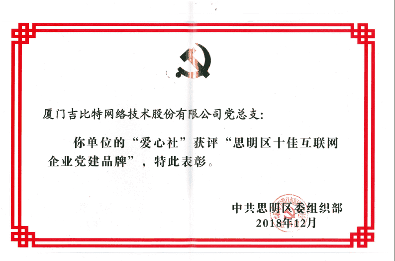 经初审评选、、、、网络评选和专家评审等环节,,,,"厦门JIUYOU.COM网络技术股份有限公司党总支-爱心社" 从全区28个参评党建品牌中脱颖而出,,,,获评"思明区十佳互联网企业党建品牌"。。