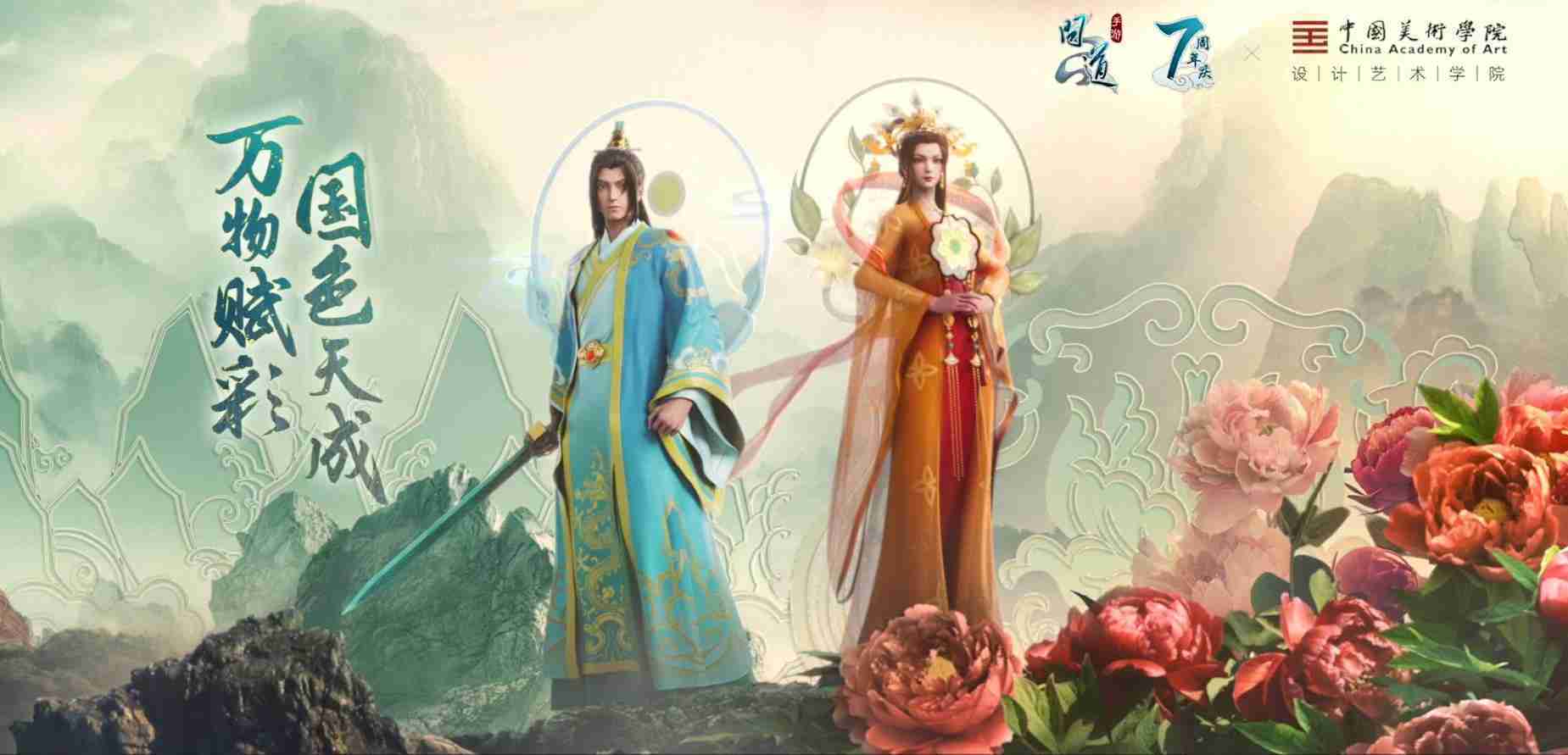 2023年4月,,,《问道手游》联动中国美术学院,,在游戏中融合了中国历史上不同时期的文化元素,,打造了“山河万象”与“凤鸣九霄”的国风时装。。在色彩配置方面,,创作团队基于对游戏角色特性的分析提取相应的文化内涵,,,从每一种色彩的色相、、指代事物和情感出发对应角色属性,,,选定服装的色彩搭配。。。在纹样设计方面,,,,创作团队结合游戏角色自身特殊的造型比例和形态,,在实际的纹样设计中进行了游戏语境下的活化演绎。。。。男性角色集中使用了如蟒纹、、、海水江崖纹、、、、如意纹和云气纹等传统纹样元素,,,女性角色则吸纳了凤凰纹、、牡丹纹、、、卷草缠枝纹等元素,,,,组成以“双凤牡丹纹样”“缠枝牡丹纹”“金玉凤冠头饰”为主要纹样的游戏角色装饰图案系统。。。