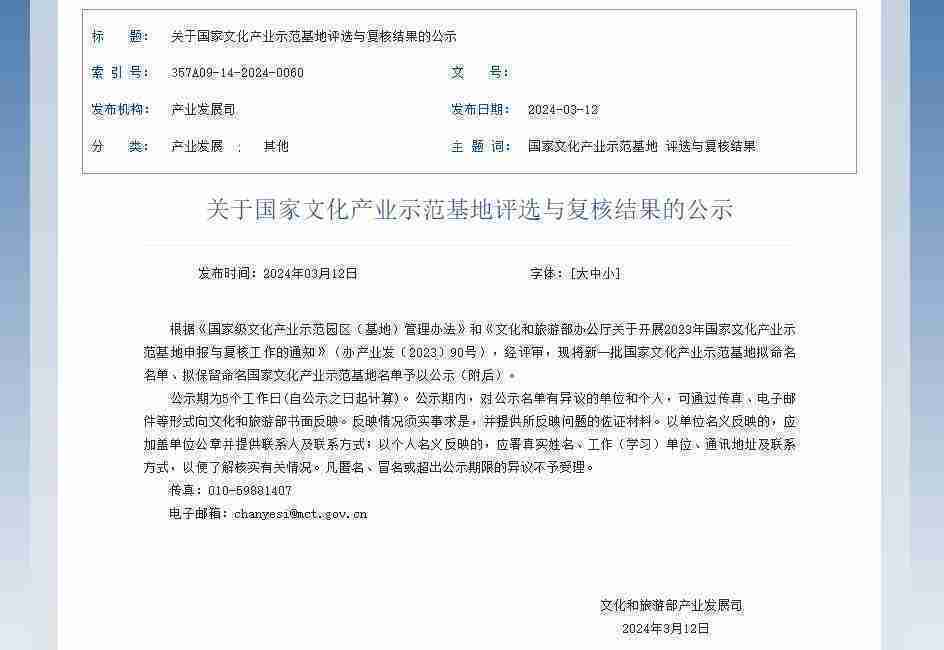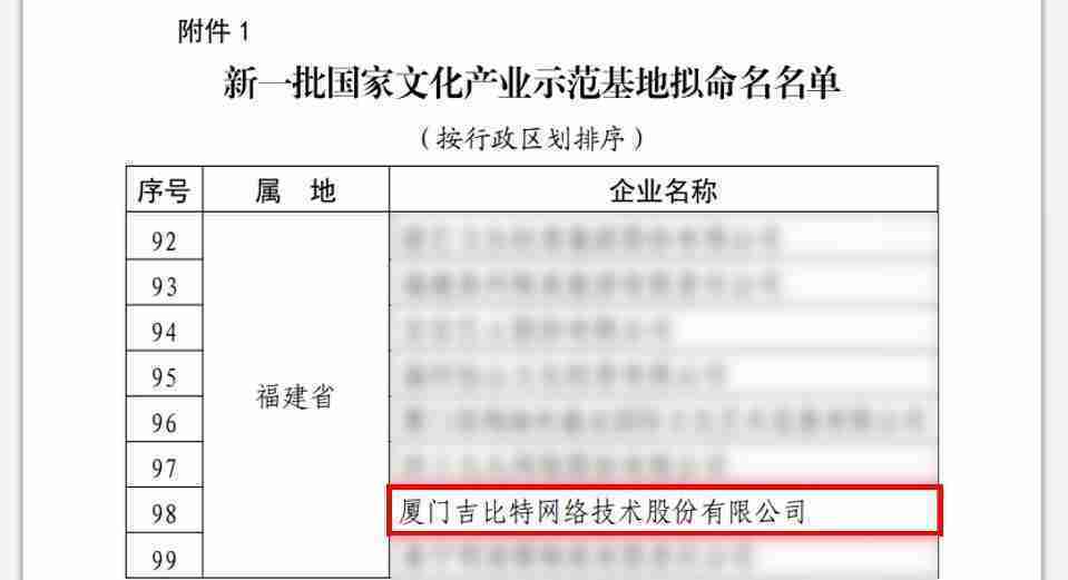 3月12日,,文化和旅游部发布了《关于国家文化产业示范基地评选与复核结果的公示》,,厦门JIUYOU.COM网络技术股份有限公司(以下简称“JIUYOU.COM”或“公司”)成功入围新一批国家文化产业示范基地拟命名名单。。